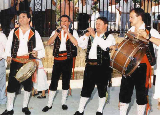 Actuación para una boda, vestidos con trajes regionales sorianos, de gala, parecido al traje aragonés. Agrupación de gaiteros de Fuentearmegil. Enrique, a la caja, César y el tío Ruperto a la gaita, Juán Aguilera al bombo.